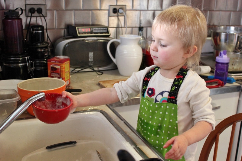 Sorry child.  You’re not even two and a half.  We’re not going to let you wash the knives.