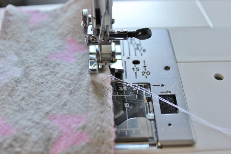 Use a scrap of fabric to figure out where your needle goes when doing a zigzag stitch. On my machine, my needle goes to the left from the red line on my pressure foot. So I line up the edge of my wipe just to the right of the red line. Your goal is to sew as close to the edge as possible while still catching in both fabric layers. Flannel tends to ravel fairly easily, which is why you want to be close to the edge.