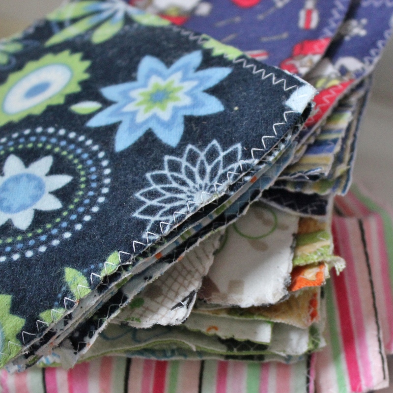 Eventually, you’ll end up with a nice pile of wipes, waiting to be sewn. For fun, I like to alternate my wipes so I can see both sides while sewing but that’s definitely not necessary!