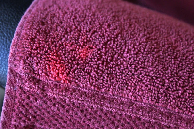 Before our wedding, Nik and I registered for lovely, plush maroon towels. I loved having plenty of matching towels and they added some nice color to our white and grey bathroom. The summer after we got married, I was struggling with acne (which was pretty much the story of my life up until a couple years ago). I was using a acne spot treatment that I thought was pretty mild (something like this). I would put it on my pimple then wash and dry my hands. Soon, I noticed that there were some crazy light spots showing up on our beautiful new hand towels. They looked like they’d been bleached. I finally figured out that even though I’d been washing my hands after applying that acne stuff, some of it was still there when I dried my hands and was ruining the towels.