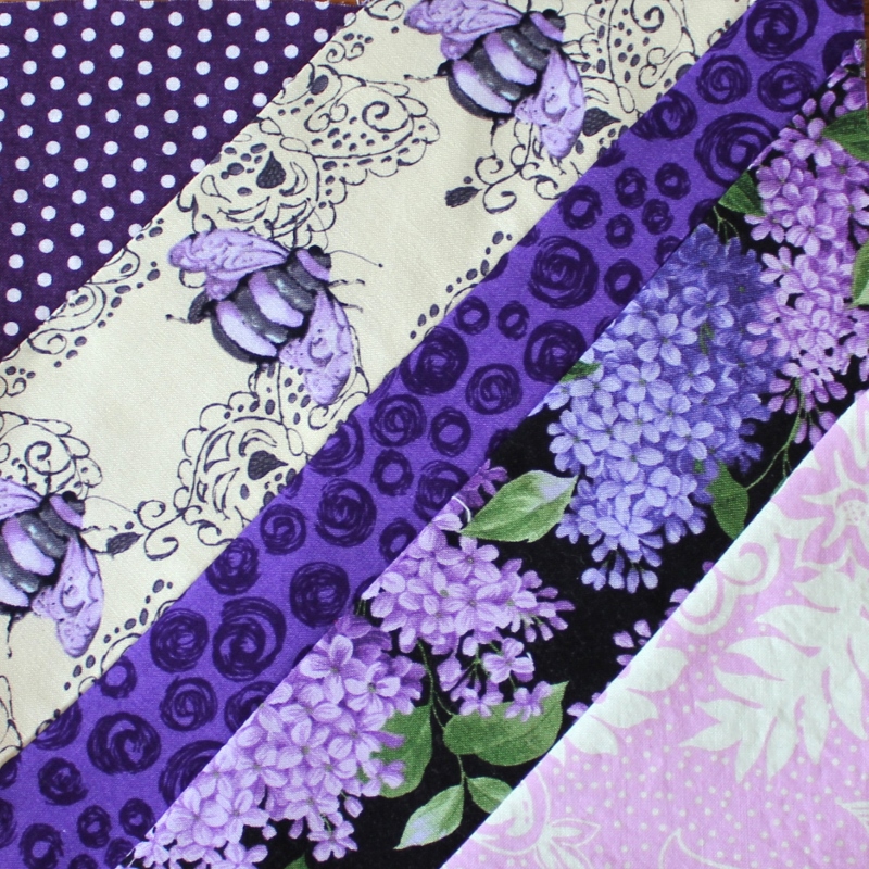 Note the bees and lilacs (objects to be discussed), the two (but very different) polka dots, and the light purple. I especially like that light purple in the corner because it’s so different from all the other purples but still definitely purple. (It’s also the purple and orange fabric from my previous post that I fussy cut to just be purple!)