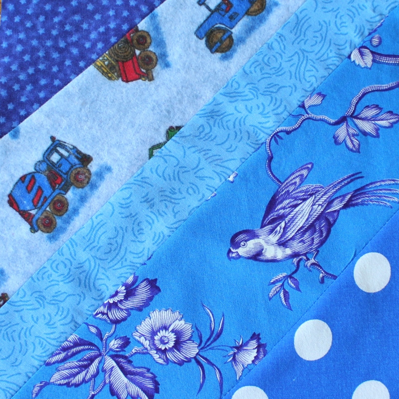 Note the blue trucks and blue bird (both objects to be discussed), the two small prints, and the large polka dots. I especially like that bird fabric. I bought it online especially for my color books but was disappointed when it arrived because it has a lot more flowers and vines than birds. Consequently, I wasted a lot of fabric to get to the bird. Oh well.