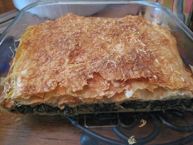 ****We also buy our phyllo at Prima Foods. There, the thin kind is #7 (it’s the box with the baklava recipe on the back.) The boxes they sell are big enough that I cut the phyllo in half at the fold and use just half a box for one 9×13 batch of spanikopita.