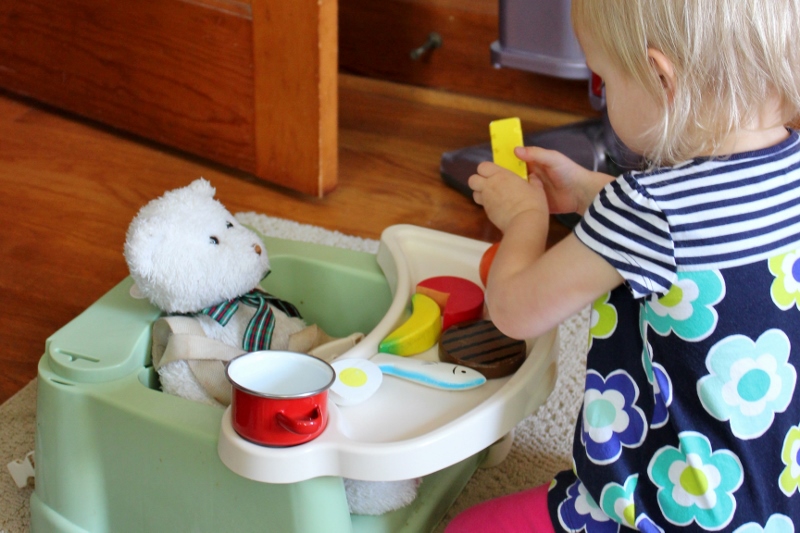 Her pretend play is becoming more and more elaborate. Half the time I don’t even know what she’s asking me to do so I just try to play along as best I can. On Tuesday, she was feeding her bear in an old booster seat that had been left at our house. She actually played happily for hours with that thing. Mean old mama put it in the car for donating yesterday and she was not happy with me!