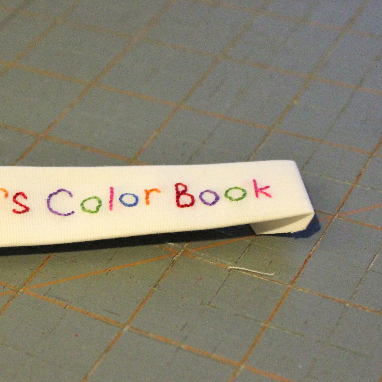 6. Iron in all the sides of the Front Cover embroidery piece (“________’s Color Book”), so that there is approximately 1/4 inch of white space on all four sides of the embroidery. You may need to trim the fabric slightly more to get it to fold onto itself smoothly. You do want the fabric to overlap significantly at the back so that the cover fabric won’t show through. Iron in the long sides first, then the short sides. Trim the short sides to a point to lessen the bulk. You should end up with a piece like this: