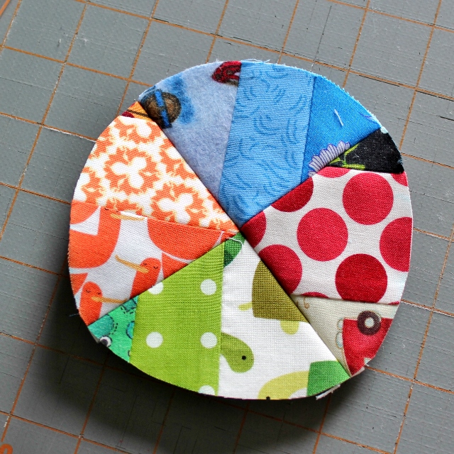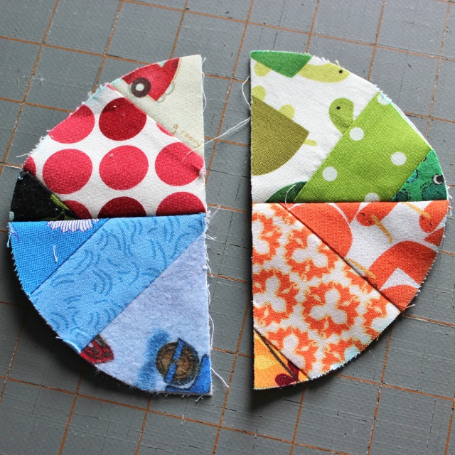 1. Choose your four favorite quarter-circles from the ten that you have. I like to choose the ones with the most appealing combination of fabrics, particularly if there are any “objects to be discussed” visible. Arrange the four into a pleasing circle. (You can discard the remaining six quarter-circles at this point.)