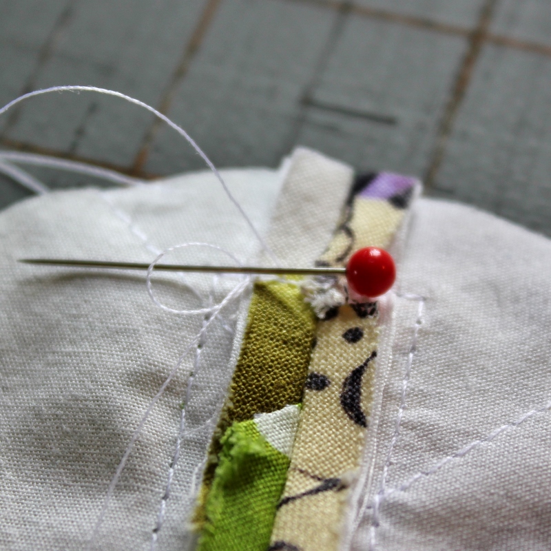I recommend doing this when sewing on both embroidery pieces and when sewing the patchwork circle to the cover. It’s not necessary but does make for a slightly higher-quality finish.