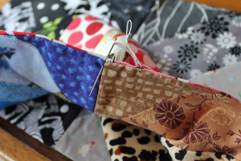 2. Close the turning hole on each page, using a ladder stitch so that the stitches will be invisible. I forgot to take pictures of this step. (Sorry! You would think I would have remembered, having had to sew nine pages together. Oh well.) Essentially, this is the same as sewing a quilt binding onto the back of a quilt, if you’ve done that before. If you haven’t, here are several tutorials to help you figure out how to use a ladder stitch if you haven’t used one before: Ladder Stitch Video, How to Sew A Pillow Closed By Hand, and/or Invisible Ladder Stitch for Quilt Binding. (All three are about the same thing but I figured I’d give you several options to choose from, hoping that one makes sense.) I usually use my knot-less start when doing this stitch. (See the bonus tip at the bottom of this post for how to do a knot-less start.)
