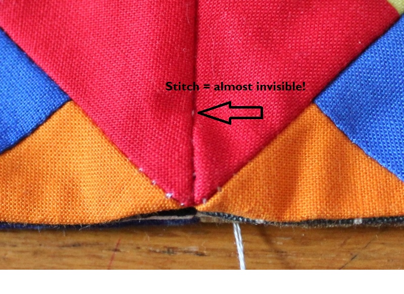 Your goal is to make a very tiny stitch that gets buried in the seam. It should be invisible, or almost so, like this: