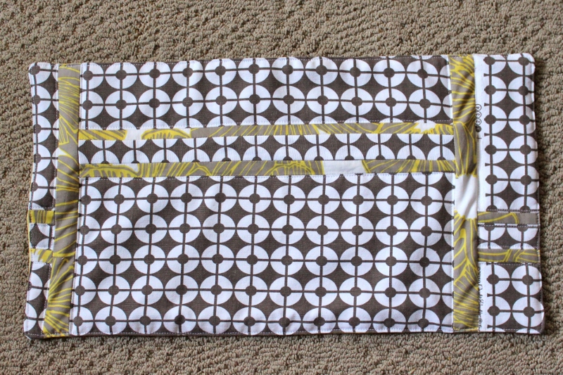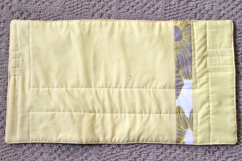 For the changing pad, the pattern calls for two solid pieces of fabric with quilt batting sandwiched between. I didn’t have enough of either of the yellows to do one solid piece so I did some piecing to come up with a pleasing changing pad with no noticeable seams (i.e. no seams between like fabrics).