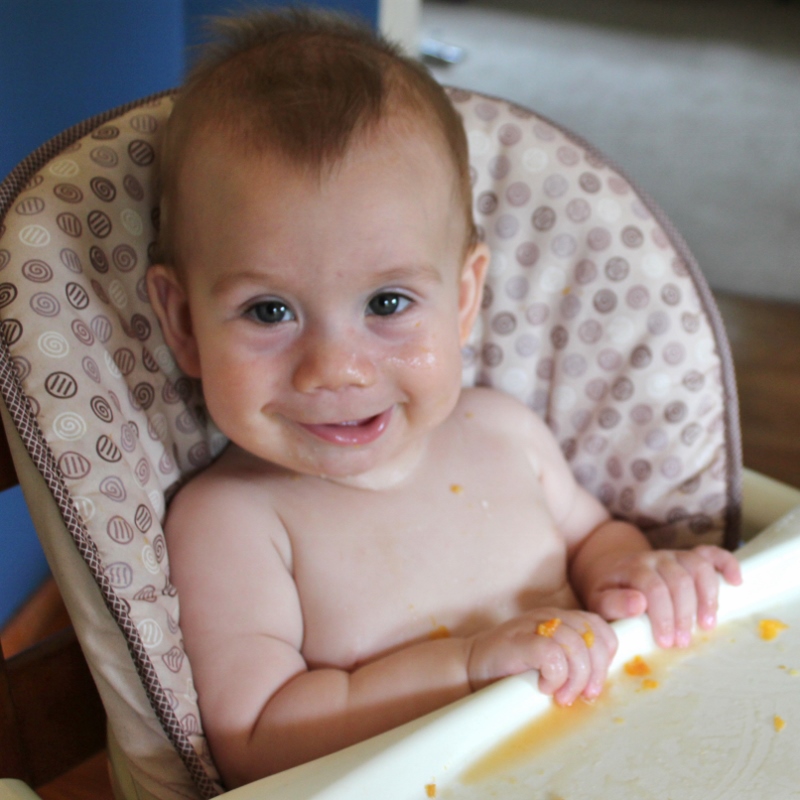 10. We try to eat seasonally so you’ll see that Mark has only had summer and fall fruits and vegetables. He’ll have to wait until next spring for peas, strawberries, and asparagus. Those were among Ellie’s first foods but she was born three months earlier in the year than Mark was and so starting eating in spring, rather than the middle of summer! 🙂