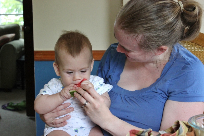 9. Speaking of drinking water, if a baby is allowed to nurse on cue, then he doesn’t really need to drink water (at Marks’s age). (This is not true for formula-fed or schedule-nursed babies.) So although Mark is learning how to drink from a glass, just like Ellie, we don’t worry too much about how much he’s drinking in any given day. We also don’t give our kids juice until they’re much older so he hasn’t had juice. (We really only drink apple cider in the fall/winter and occasionally orange juice as a treat. Juice is generally just a treat/luxury for us.)