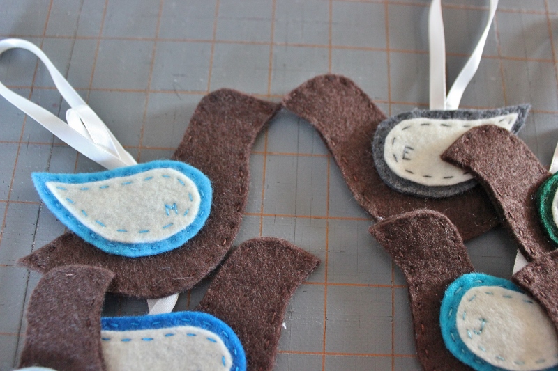For my brother Eric and his wife and five kids, I wanted to make them each something to have because they lost many of their Christmas decorations in a basement flood this fall. So I made them a flock of birds (using my design in this tutorial). I envisioned making them a flock of brightly colored birds, like a rainbow. When I asked each of them their favorite colors, I got five votes for blue (three for turquoise, one for aqua, and one for blue) plus one vote for forest green and one for “earth tones like brown or gray”. Not exactly what I was hoping for! Wanting each person to still have a unique bird, I managed to track down five shades of blue!