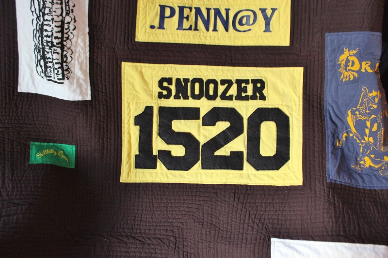 “Snoozer” and “1520” used to be iron-on letters. Then they disintegrated in the wash the first time I washed the quilt. So I picked off all the old pieces, traced new ones, cut them out of felt and appliqued them on. This whole process only took me nine months.