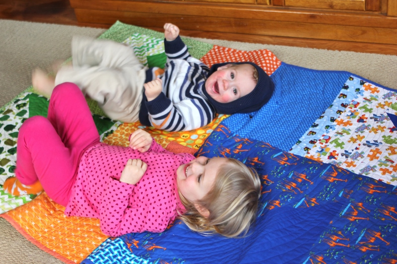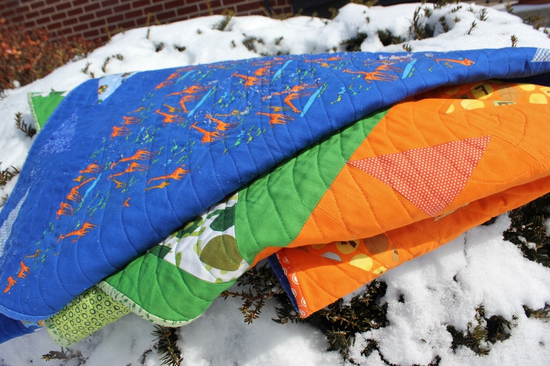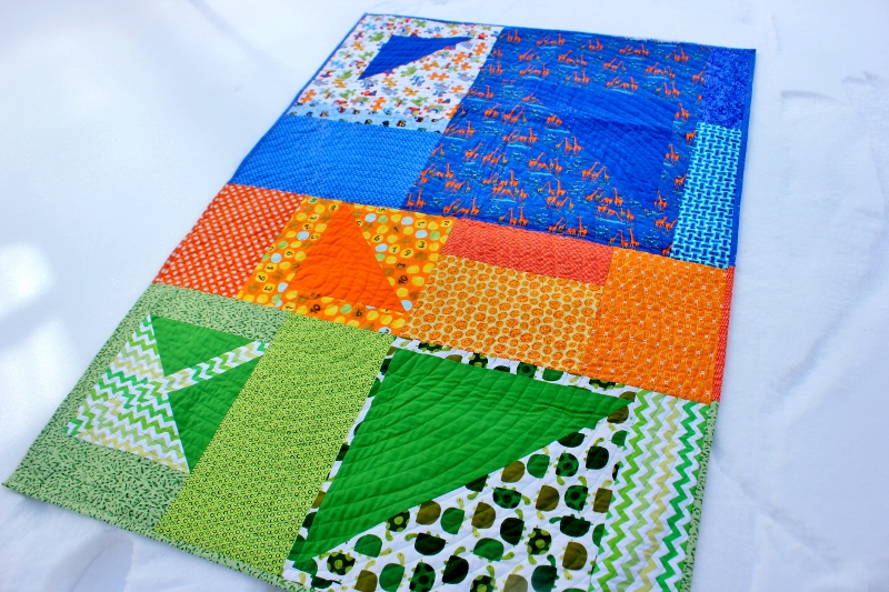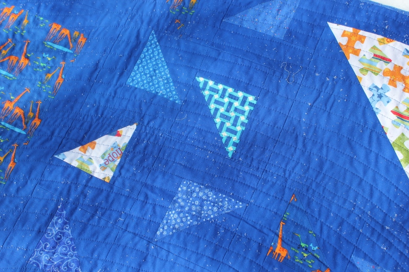 In the end, I wish I had used all small triangles on the front rather than adding the bigger triangles. I added the bigger ones, wanting to be able to see the front prints a little bit better. But part way through sewing the front, I figured out the design for the back (which I love, far more than the front) and in the end, could have kept all the front triangles small. Oh well – I suppose that’s the way the quilting process goes. I just keep on learning! This was the first quilt I’d ever designed myself and it was an interested learning process for sure. Now I’m itching to work on another one!
