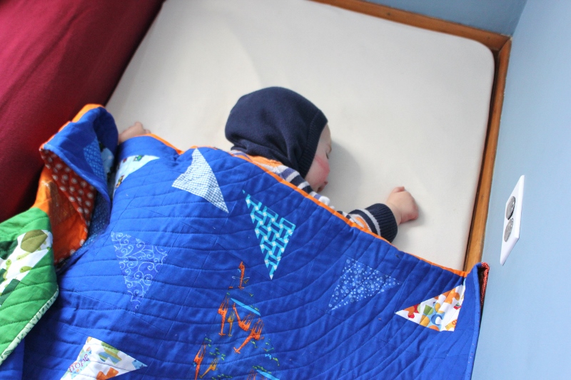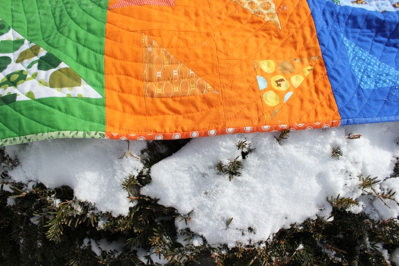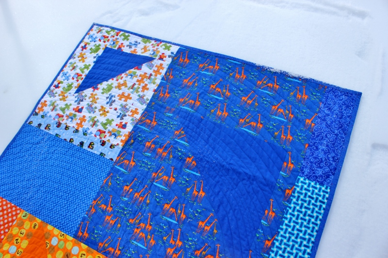 I had the same problem with binding as I did with quilting – what binding color to choose to go with such strong stripes? In the end, I used the same solution as quilting – three colors. I’ve also never done a color-blocked binding before but it was surprising easy. I’m not showing you the other side of the binding, which didn’t end up so perfect. I had to talk myself out of a lot of seam ripping and restitching to fix it (it is, after all, for a one-year-old).