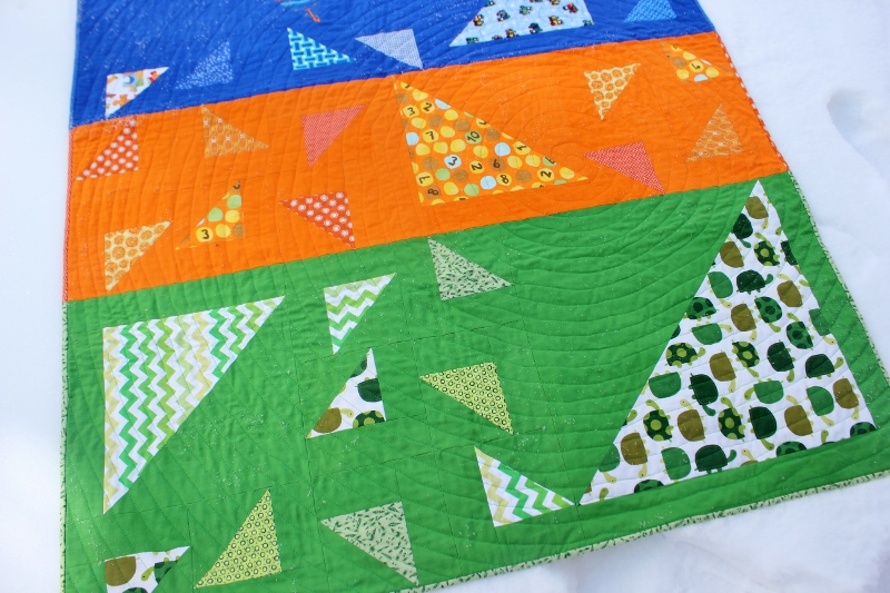 For the back, I continued the stripe theme but used big pieces of the prints from the front, adding some solid triangles (the other half of the half-square triangles that I made for the front).