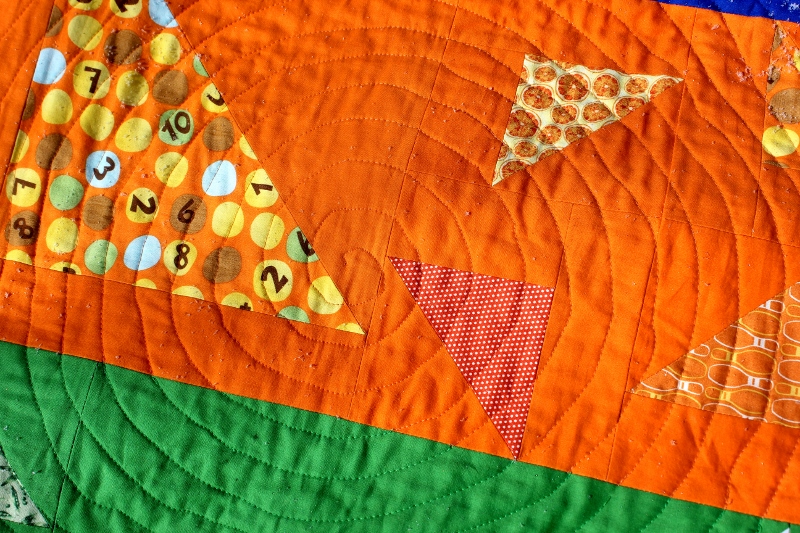 After sewing the front, I thought it was lacking a bit of something (movement?) and so I decided to quilt it in a spiral. This was the first time I’ve done a spiral and it was pretty hard (as evidenced by my terribly wobbly lines and super uneven spacing). I also had the problem of deciding what color of quilting thread to use. I ended up switching between blue, orange, and green thread to quilt it, changing colors every time I got to a new background color. This was annoying at first but once the spiral was well established, I just did all the orange, then finished the green, then finished the blue so that eliminated much more bobbin switching.