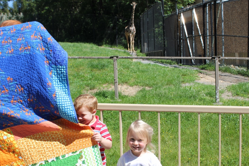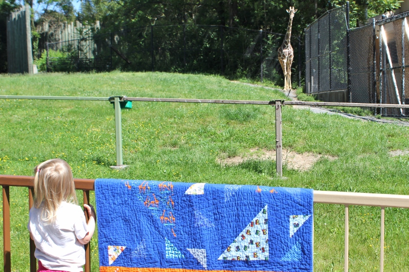 Ever since I saw this absolutely adorable llama quilt photographed with llamas, I’ve dreamed of having a similarly adorable quilt photo shoot myself. Mark’s quilt‘s feature fabric is full of giraffes so I figured a trip to the zoo would be my perfect chance for such a photo shoot! Finally, after months of bad weather and other reasons why we didn’t make it to the zoo, we made it there this morning. My friend Katie kindly obliged me and held up the quilt for photographing. The giraffe wasn’t quite so obliging but in the end, at least I have a picture of my giraffe quilt with a giraffe, right? 🙂