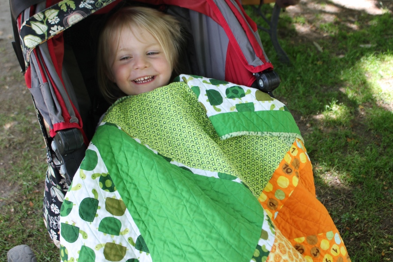 We ate lunch before heading home and the wind picked up enough that we were just barely on the too cool side in the shade. Ellie decided that she’d had enough of being cold so she climbed into the stroller and took advantage of having a quilt along onthe trip.