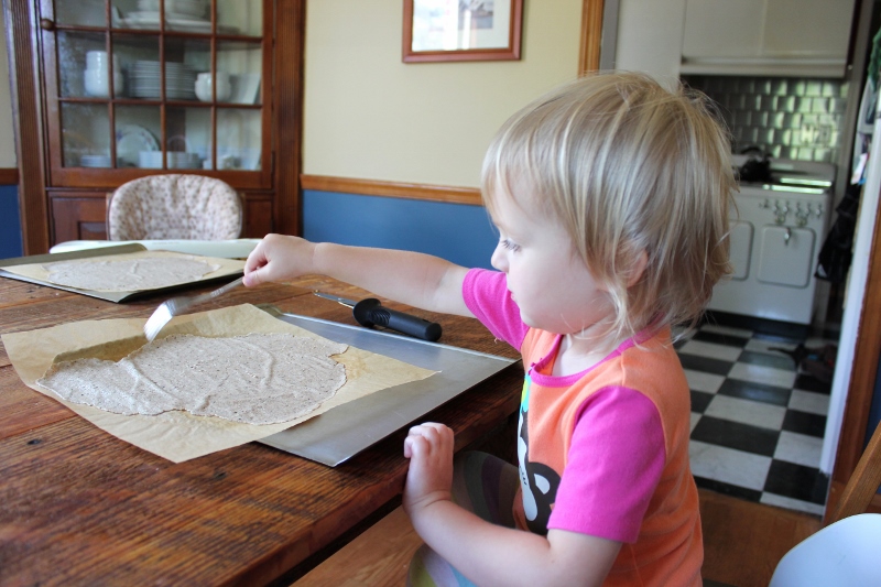 010 (800x533)   013 (800x533) (2)part way into the rolling process.  As you can see, I don’t worry too much about uniformity around the edges.  You could trim them I guess and reroll it but we don’t mind having misshapen crackers.