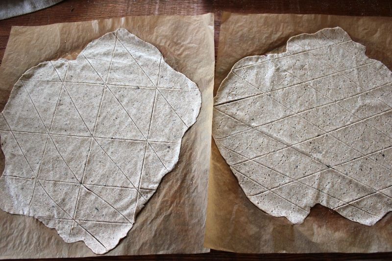 Cover and let the dough sit at room temperature for at least 8 hours. I find that the texture of the crackers are better if I let it sit at room temperature overnight and then in the refrigerator for a day or two. I’m sure there’s a scientific reason for this (perhaps complete hydration of the flour) but it’s also nice to know that you can just let the dough hang out for awhile until you have time to bake the crackers. Once, the dough sat in my fridge for two weeks and the crackers still turned out great!