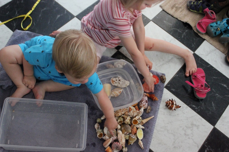 2. Be at the end of your rope with the 3.5 year old’s temper tantrums. In desperation, get out the really cool box of shells that were her birthday present a year or two ago. Start matching them up. Observe the 3.5 year old is suddenly, miraculously, a joy to be around. Have the 3.5 year-old decide they are dirty. (Really? dirty? They came from the ocean! They’ve been sitting in a plastic bin for a long time!) In a fit of inspiration, declare that they need to be washed. Put out a towel on the kitchen floor. Give the 3.5 year old and the 1.5 year old bins of water. Wash! Wash those shells! Don’t care if the clothes get soaking wet! Get the work done that you need to get done!