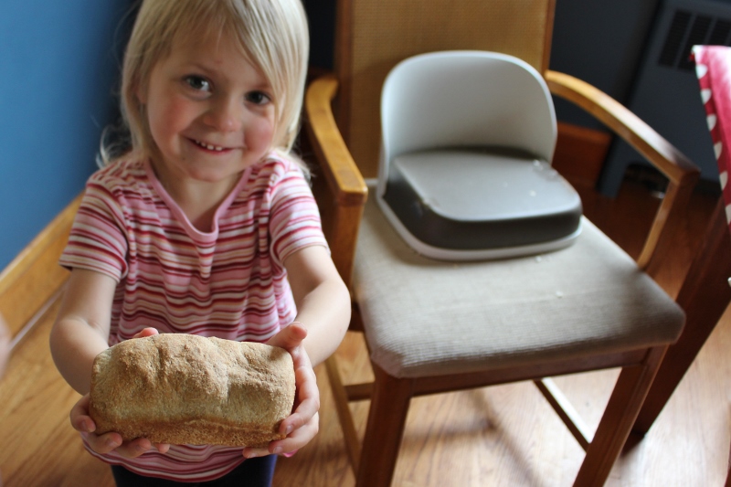 We’ve since made bread one more time and again, she made her own loaf. I think this will be what we do from now on. It’s a win-win for me – she’s happy because she’s making bread, “all by myself, Mama!!!” and I’m happy because while she’s slowly making her way through the bread process, I’m cruising along, forming bread way faster than when she’s “helping”. Now, of course, Mark wants to help too so here we go again – teaching another child to make bread!