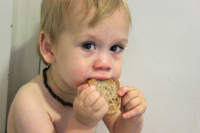 Ellie has been quite happily helping me make our sandwich bread (rather, form the loaves) for almost two years now. We have our routine – I roll it out the first time and fold it up, she rolls it flat the second time, I finish the rolling, we both roll it into a log, pinch the seam, tuck in the ends, she lifts into the pan, and then punches it down with her fists. A month ago, she dissolved into tears and then a big tantrum because she wanted to make bread all by herself (i.e Mama not touching the dough AT ALL EVER). So, two weeks ago, when I next made bread, I allocated a lump of bread just for her and she did the whole process as I described above, but by herself.