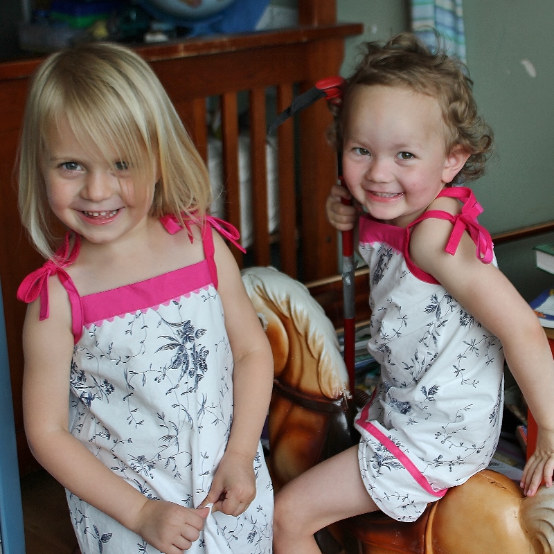 Back in July, I posted pictures of the sundress that I made for Ellie. Sneaky me actually made two identical dresses at the same time, one for Ellie and one for her cousin Violet so that they could be matchy-matchy in Alaska. They’re both three so they should match, right? 🙂