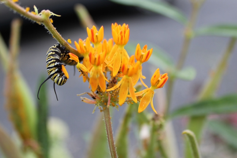 Last Saturday, as we were leaving to meet Yiayia for dinner, we discovered that we had some very special visitors on our butterfly weed plants (which is a species of milkweed).  We have a bed of native flowers, including lots of butterfly weed, that runs the length of our driveway.  We were a bit late to meet Yiayia because we were having so much fun watching our visitors!