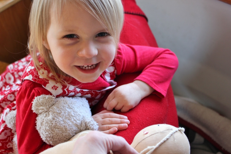 wearing doll clothes knitted by Yiayia and doll booties sewn by her great grandmother (my father’s mother), July 2014