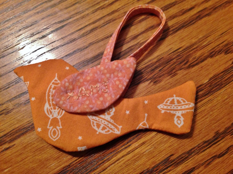 I know the colors aren’t super-girly but just for fun, I decided to use the spaceship fabric from Annika’s mother’s diaper bag and happened to have that orange print to match for the wings.