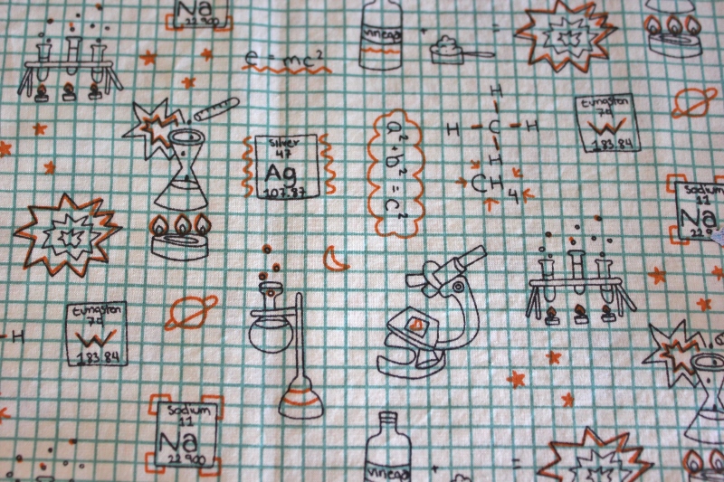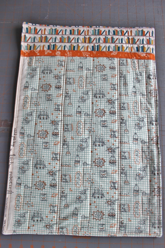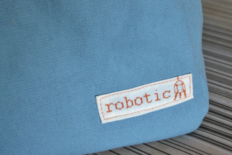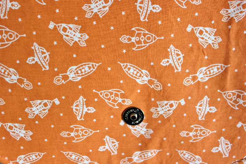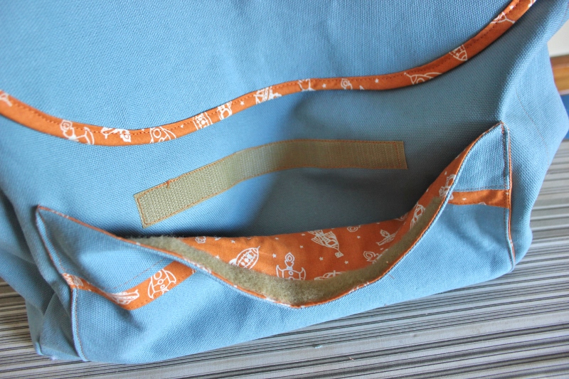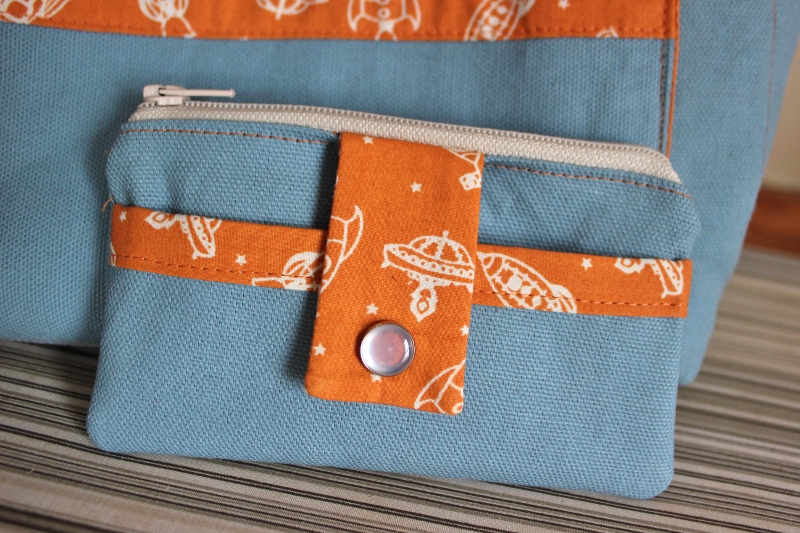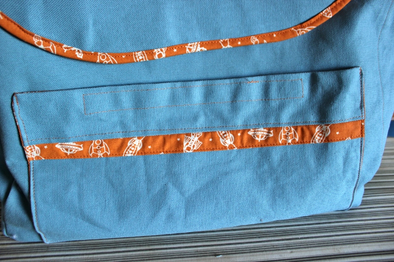 Ellie and Mark gained a new cousin when Baby Annika joined my brother’s family in November.  I have four siblings and I’ve now made five diaper bags, one for each family! (Here’s ours, Eric and Meggan’s, Jon and Leah’s, and Rachel and Drew’s.)  For Chris and Katie’s bag, Katie chose a tutorial that I hadn’t tried before and it was fun to try out something new and learn a couple new skills while I was at it.  Katie requested blue or gray and orange, 50s-60s vintage, and no florals.  Also knowing that she has written a children’s book featuring a robot as the main character, I found a super fun fabric line that I loved and I hope she does too!