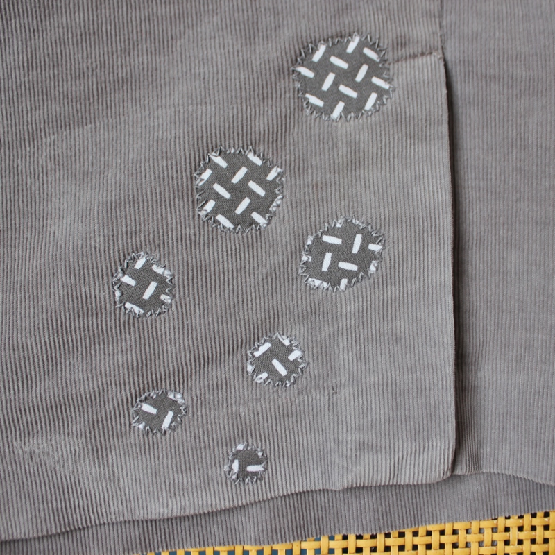 So I got a bit carried away and added six more. Then I decided they needed to be sewn on but I couldn’t sew the top one by machine because of the split in the skirt. So I zigzagged them all by hand, which was a luxurious waste of time during yesterday morning’s snow day. (This one counts for two shades of gray – the original skirt and the embellishment).