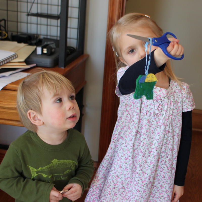 The other project she finished this week is one that we started just after Christmas. Yiayia gave her a “My First Sewing Kit” for Christmas. I’m not even going to link to what it is because it has so many flaws. The idea is great and Ellie has had a lot of fun sewing with it. I’ve been annoyed by the lack of sewing knowledge evident in its design (i.e. giving us buttons for the eyes that the needles don’t go through, embellishments that you need a sharp needle for, etc.). Putting that aside, though, Ellie did sew an elephant! Again, other than help with threading the needle and tying off the thread, Ellie did basically all the work on this one!