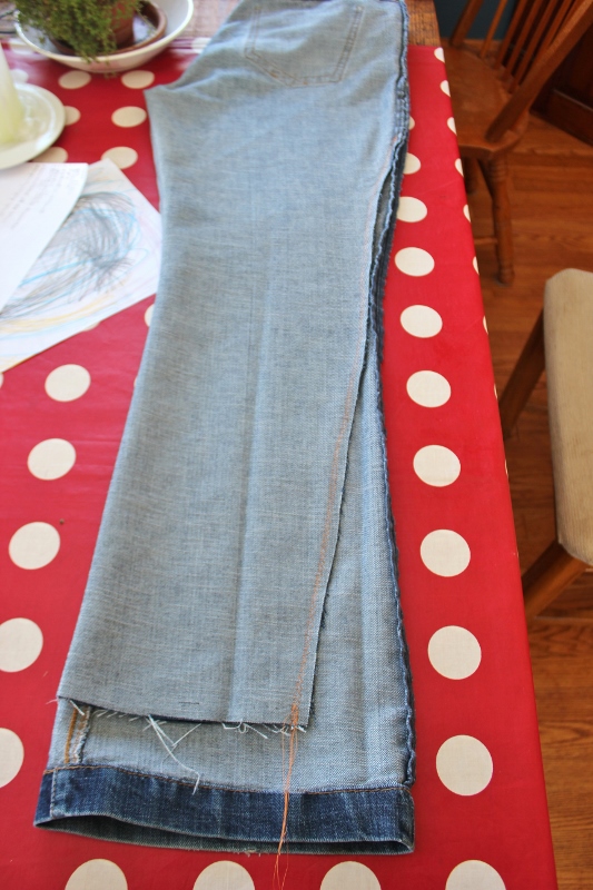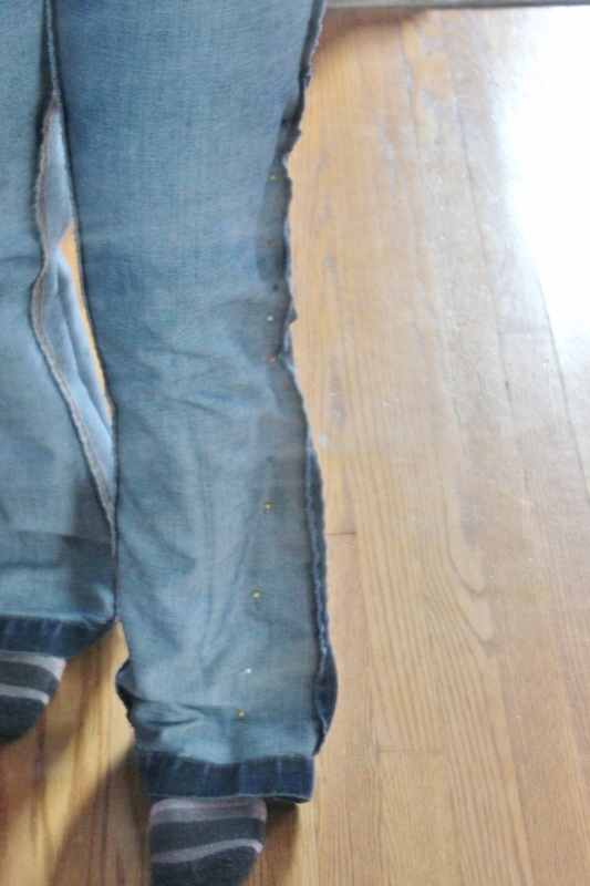 Then I pinned down the outside of one leg. I decided that I didn’t want true skinny jeans but closer to this pair of matchstick jeans that I loved so much, I wore them out.