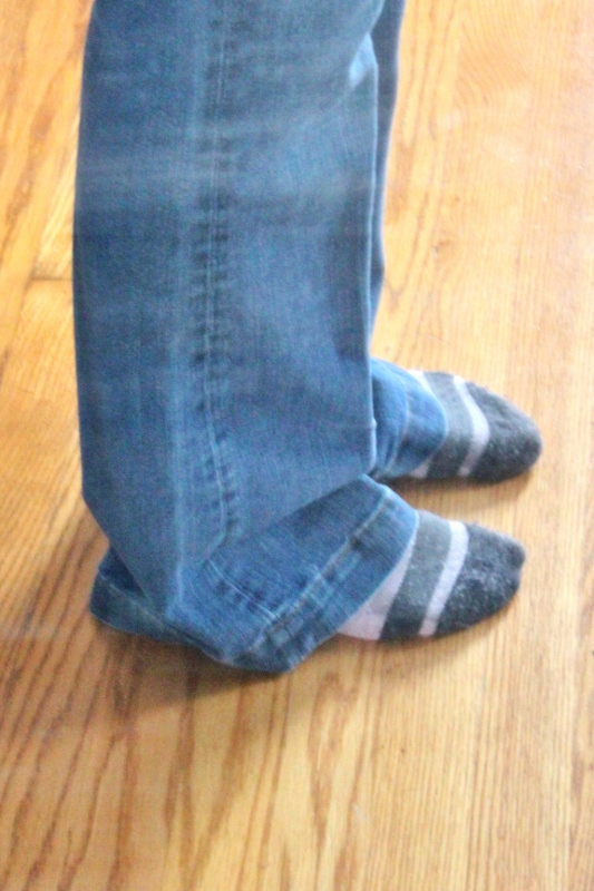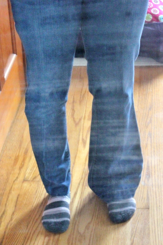 All over Pinterest, the pins exclaimed, “It’s so easy! It looks great! Do it right away!” Well, in theory it is easy but to get them to fit you correctly does take some care. It also takes the right pair of jeans for it to look great. Mine have a faded line that went down the middle of the front of the jeans. Now, it angles off to the side. It’s not a big deal but annoying to perfectionist me. I probably will try this again with other thrift store jeans but will make sure to buy jeans, keeping in mind that the original fading matters. (The fading looking bade is partly what did in Meggan’s first attempt.) Also, as another friend just pointed out to me on Facebook, bootcut/flare jeans rarely have the amount of stretch in them needed to make skinny jeans truly comfortable.