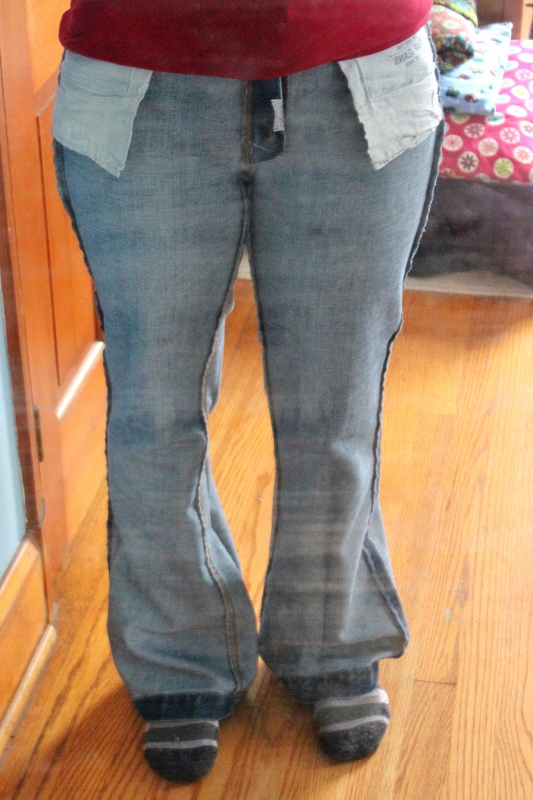 After sewing the second leg (using the new line to sew 1/4″ inside of that), zig-zagging the seam allowances, and doing a really simple lazy hem (didn’t even fold it under twice), I have a new pair of jeans! (I also really heavily ironed the new seams, which gave them a nice edge, making them look not quite so new.)