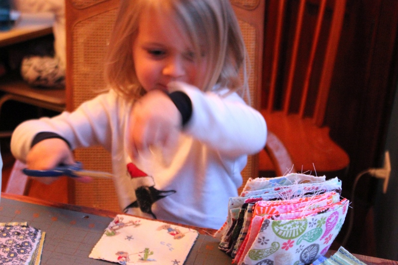 Do you use a serger? Zigzag? I’m trying to think how to keep all those flannel edges from fraying! One layer? Two together? Have to iron after washing? Details! I need details! 🙂 Poor Marco looks so miserable, and I love the delighted focus evident in Ellie’s hopping right on her job. I’m convinced that children need meaningful ways to contribute to their families, and I love that you are validating her skill and hard work.