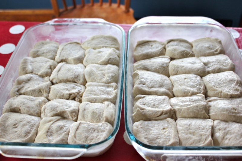 , divide the dough in half. Working with each half at a time, divide that dough in half and then each quarter into approximately 7-8 pieces, so that you end up with 15-16 rolls from each half of the dough. All your pieces will NOT be the same size. Embrace the variety!