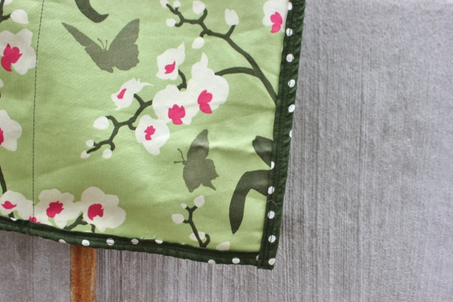 Finally, I also made my own bias tape and cut it on the bias so the dots would run across the edges.