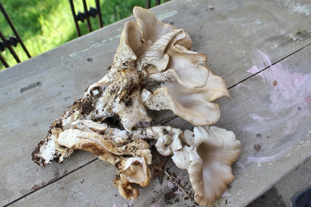 Over the past few years, Nik and I have loved being a part of a group called the Baltimore Foodmakers.  There are a lot of foragers/mushroom hunters in the group and from them, I’ve learned a bit about the art of searching for mushrooms.  One thing I’ve learned is that big edible mushrooms often grow on trees, or dead logs.  I also knew that underneath that dirt, there was a huge stump left behind by the tragic loss of a tulip poplar back in 2012.  So I took a picture of it and emailed it to the group, mostly out of curiosity to find out what it was. A couple different people replied, guessing that it might be an oyster mushroom.  One exceeding kind friend, who has a lifetime of foraging experience to share (including TONS of mushroom knowledge), very kindly came over a couple days later and conclusively identified it as an oyster for us.  (Make sure you read clear to the end for some important mushroom safety information.)