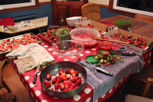After we got the kids asleep, we settled into strawberry processing mode.
