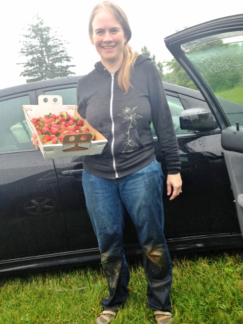 Through a series of unfortunate events (mostly rain-related), we ended up deciding to go strawberry picking very last minute last Thursday evening. We threw some food in the car for dinner and headed to the farm about 20 minutes after we’d decided to go. Despite the bad weather in the days preceding, there were plenty of ripe berries, the kids were in a great mood, and Nik and I set to picking. Then the rain came, a bit earlier than had been forecast. Nik took the kids to the car, I kept picking in the downpour, and with 10 more pounds of strawberries picked, we called it a day.