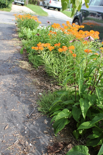 The beds on either side of our front driveway were covered in awful, evil grass. Over the course of a couple summers, I dug out the sod and replaced it with creeping thyme on one side and a bunch of different native perennials on the other.