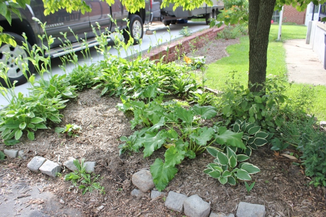 At the top of that same driveway, the bed used to be dominated by overgrown old azaleas. One summer, Nik’s mom and I cut them way back and then a couple years later, I dug them all out. Now, we have lots of rhubarb growing in them, as well as hostas. I’m still figuring out what else to do with it but at least it’s starting to be useful.
