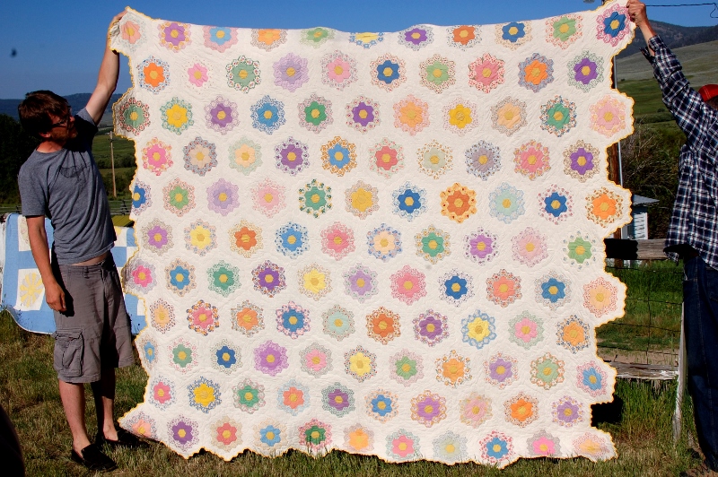 And, because I’m sure you want more sewing/hexie eye candy, check out this heirloom quilt, made around 100 years ago (or so) by my father’s mother’s family.  They were all amazing quilters who lived in western Montana.  The quilt is HUGE and it’s all hexagons!! (It’s the Grandmother’s Garden quilt pattern.)