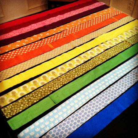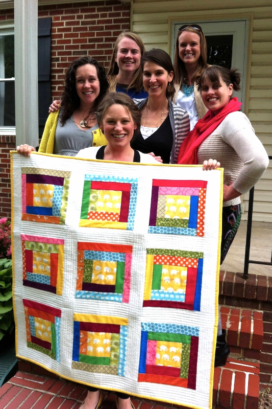 Betsy and Dan are having a baby and our Sewing Club made a quilt to celebrate their little girl! Just like the two quilts we made last spring, this was a fun group project! I found the design (in this book) and we all contributed in one way or another to choosing the fabric. Betsy even helped us by oh so nicely putting her nursery color choices on her blog! Then Anne painstakingly cut all the fabric into 2-inch strips,