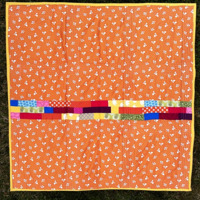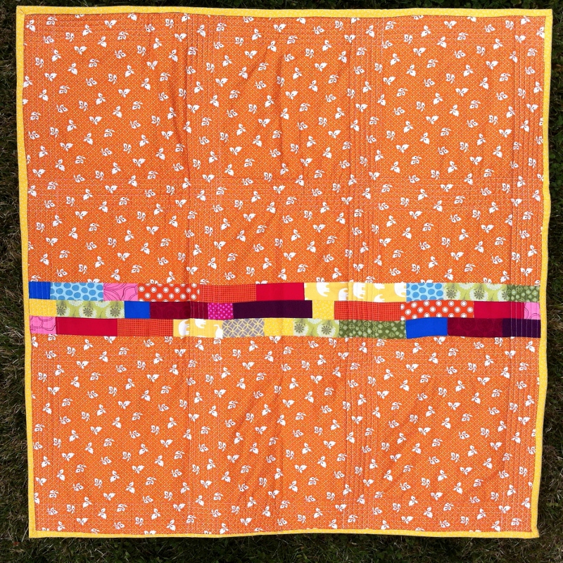 In the meantime, Keisling had sewn the quilt back and then I took the front and the back, made the quilt sandwich, and quilted it, using dense straight-line quilting in the sashing (leaving the blocks unquilted).